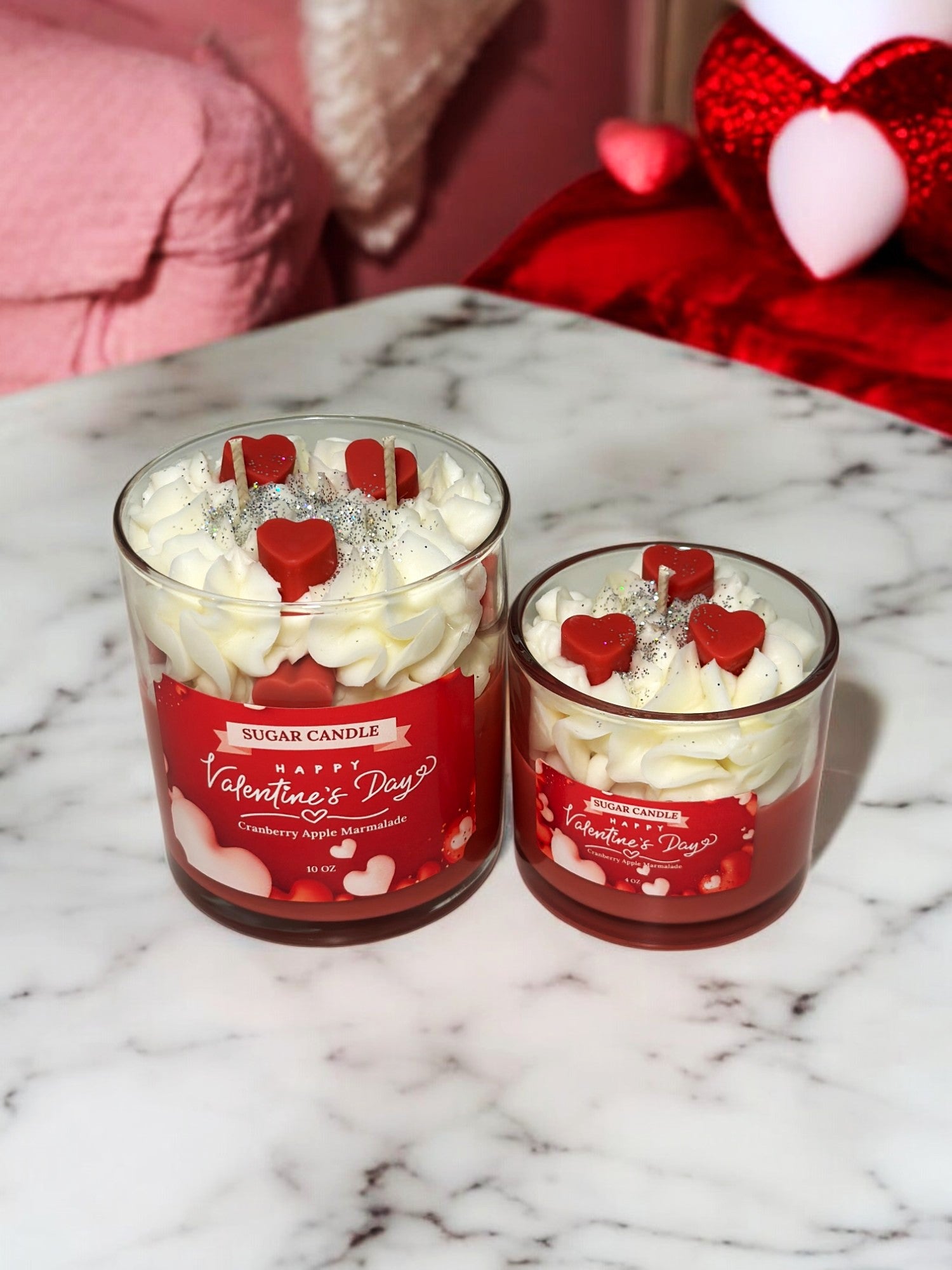 💘 Valentine’s Day Candle, Handcrafted with love by Sugar Candle, featuring a red base, whipped white top, and delicate red hearts sprinkled with silver glitter. ✨